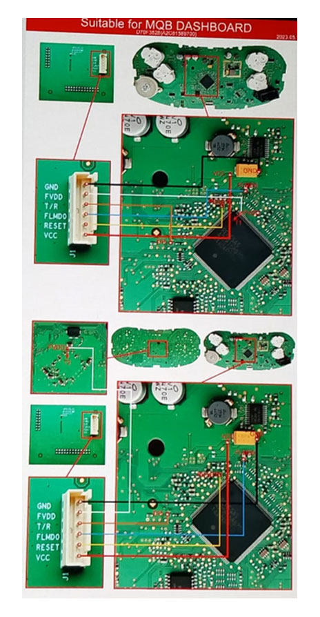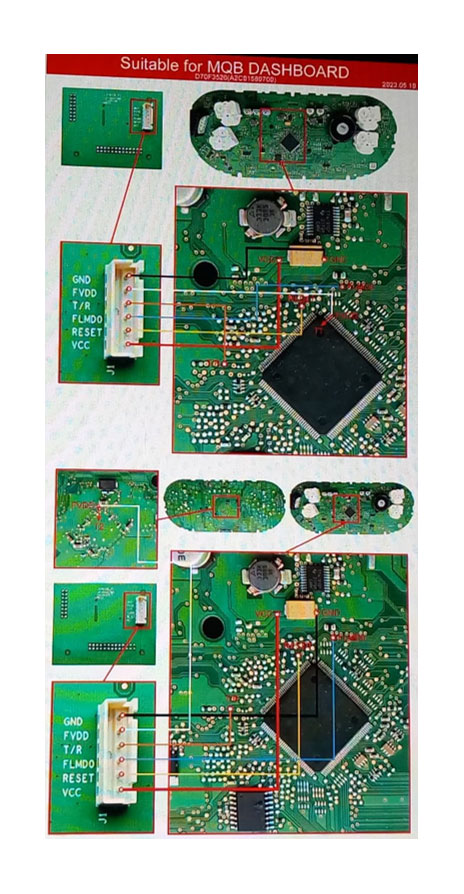 Step 4: Find position T1 in the figure and perform pin lifting (After the pin is lifted, the FVDD line needs to be connected to the lifted pin), or find position T2 in the figure where line cutting is needed and perform line cutting.