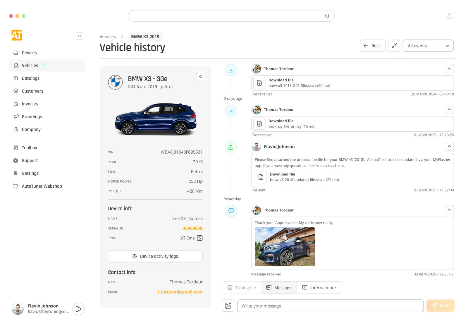 À partir de ce moment, le client peut communiquer avec vous en utilisant le chat intégré, lire les données de son véhicule, vous envoyer le fichier et écrire les fichiers réglés qu'il reçoit de votre part sur le véhicule.