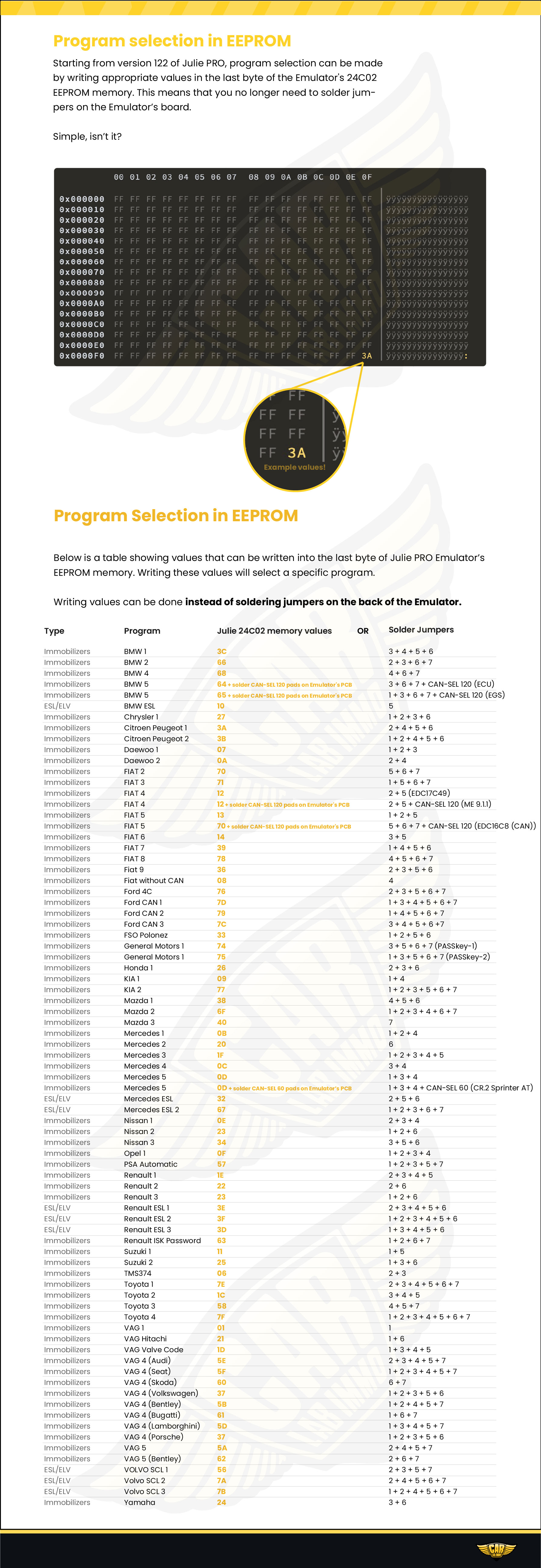 Program selection and writing values is made in Julie PRO 24C02 EEPROM. And if you use 24C02 EEPROM Memory Adapter for Julie PRO , you will no longer have to solder jumpers or unsolder Julie 24C02 EEPROM.