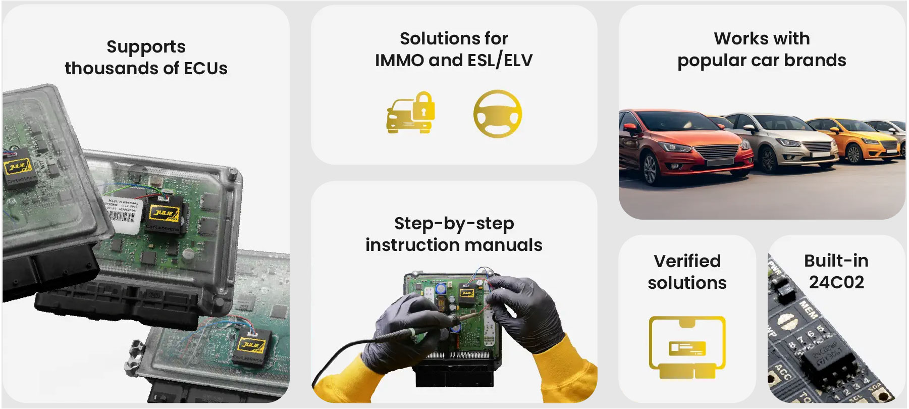 Damaged Electronic Steering Column Lock (ESL/ELV) is a common fault in many car models, the repair of which may get really expensive. Luckily, there’s Julie PRO Emulator! By installing the Emulator in the place of the damaged ESL/ELV module according to instruction manuals, you can save a great deal of time and money!
