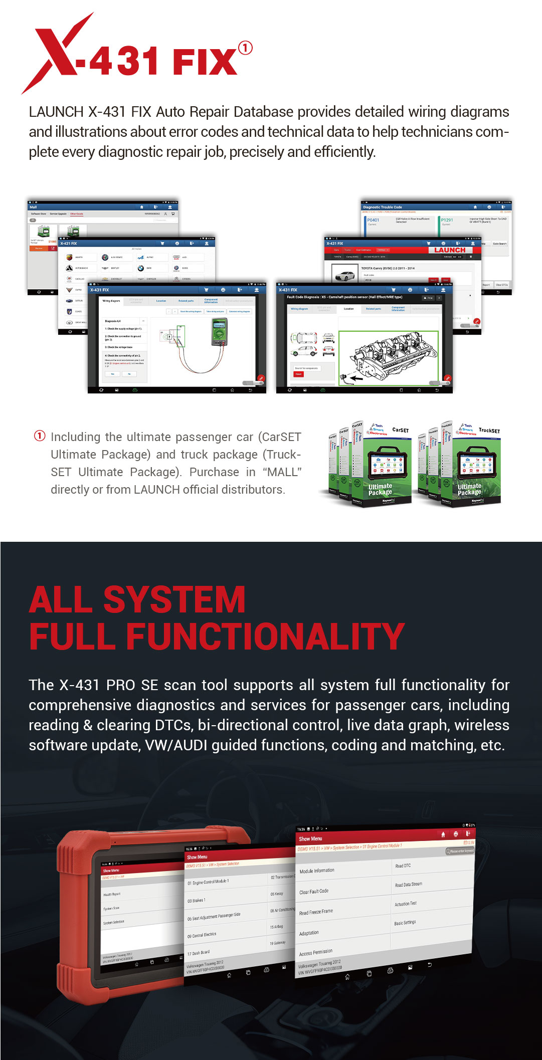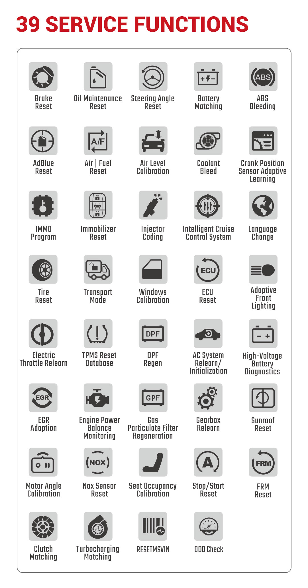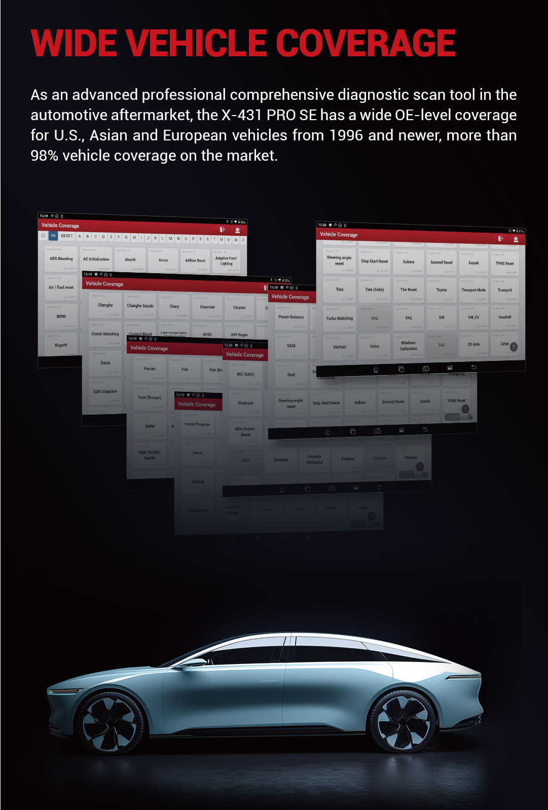 Optional ADAS calibration capability for calibrating LDW, RCW, AVM, NV, BSD and ACC system with the X-431 ADAS calibration tools.