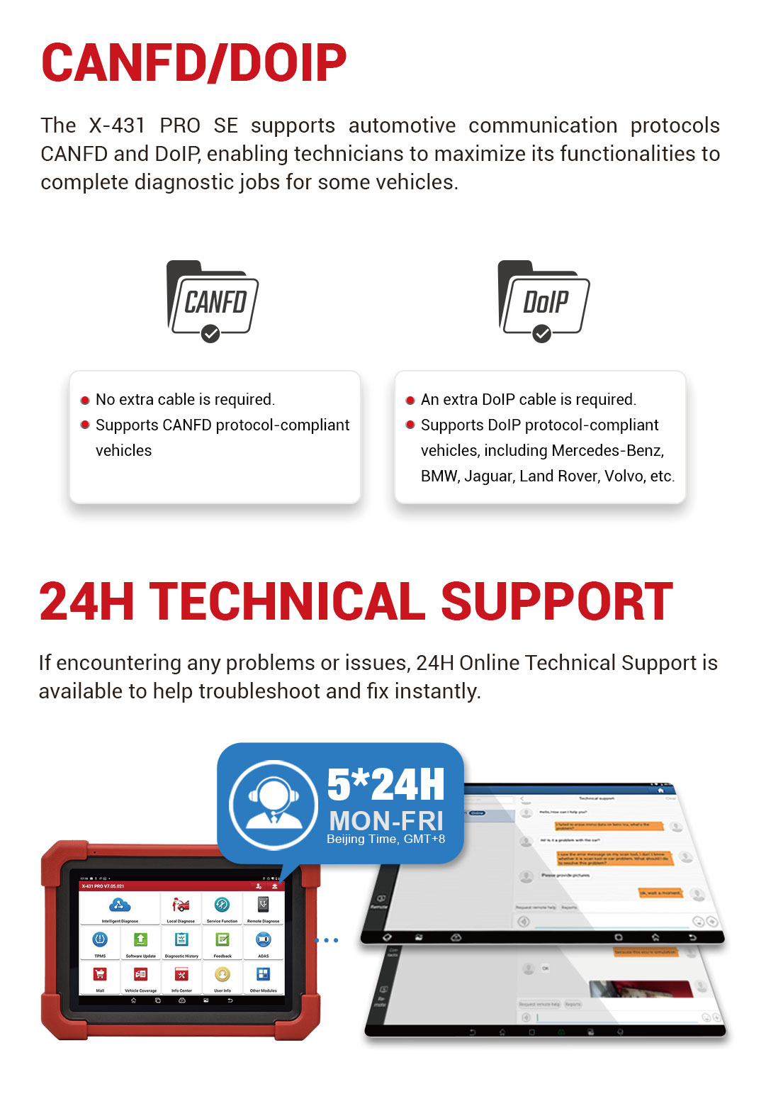 Brand new designed VCI supports even more communication protocols, e.g. CAN, CAN FD, DoIP*, etc. (*Need an extra DoIP cable)
