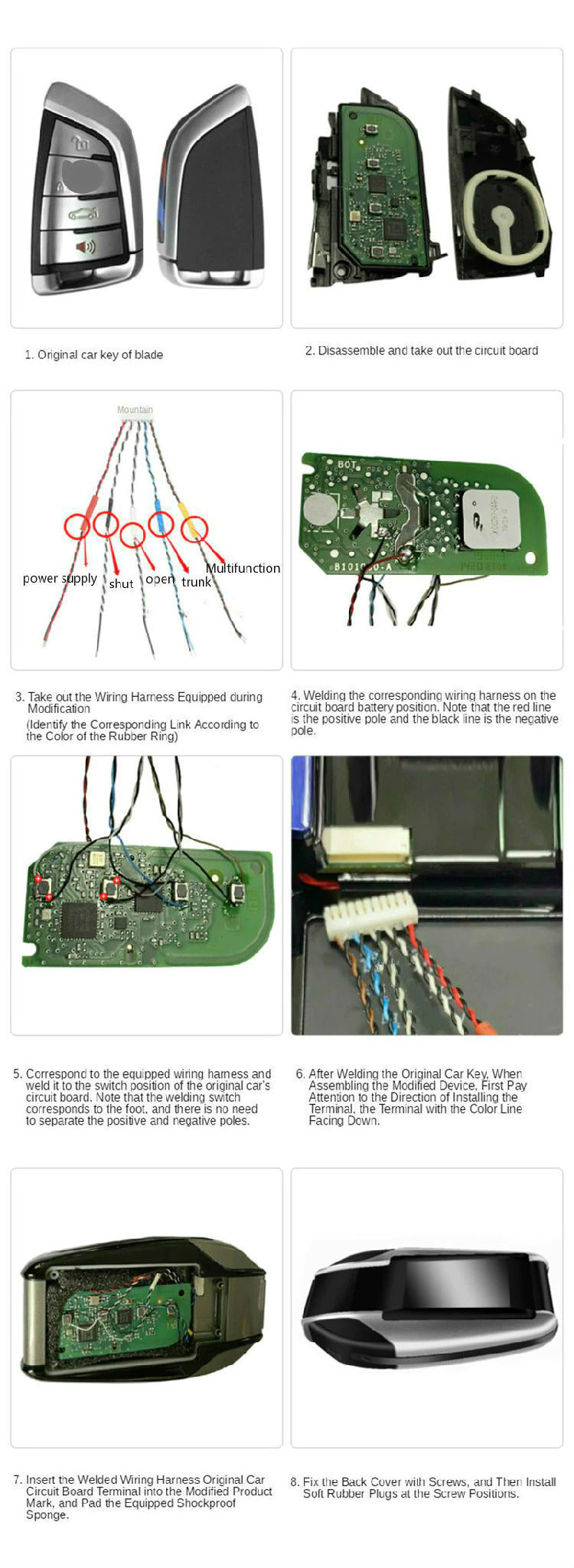 4. According to the schematic diagram, weld the connecting wire harness to each key function switch of the original car key board.