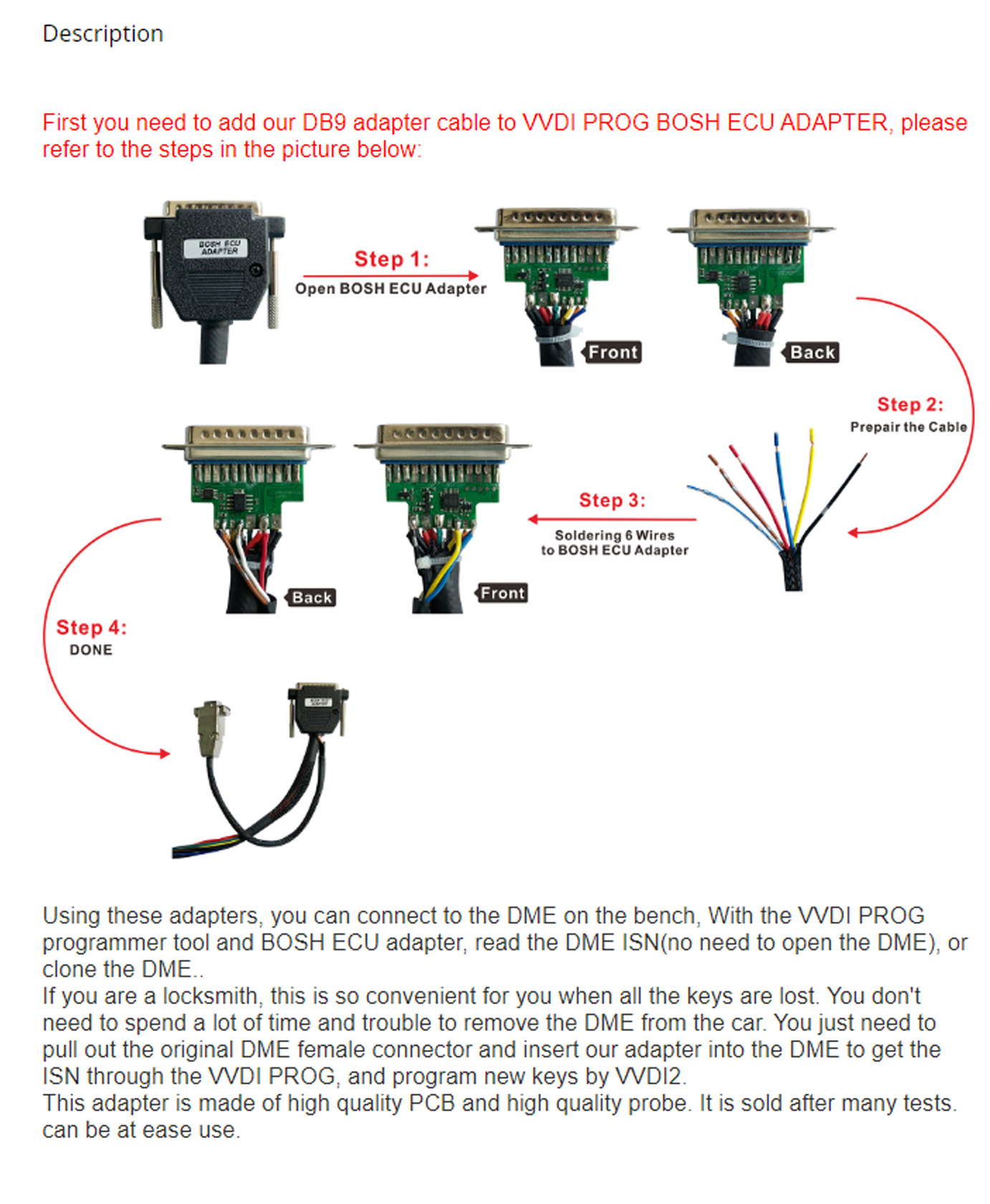 Se você é um serralheiro, isso é útil ao executar Todas as chaves perdidas. Você não precisa perder tempo removendo o DME do veículo. Você só precisa retirar o conector fêmea DME original e inserir o adaptador no DME para obter o ISN através do VVDI PROG e programar novas chaves usando o VVDI2