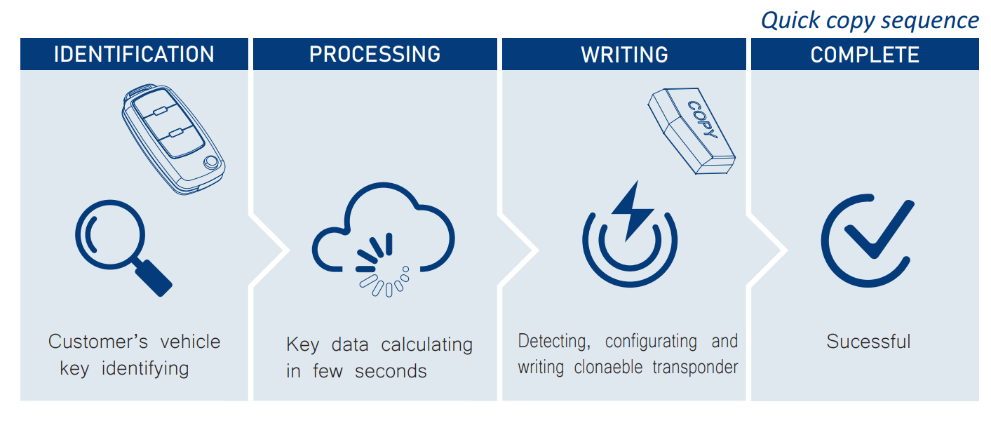 A maioria dos transponders de veículos, incluindo transponders de criptografia como Texas® Crypto-2 80 bits e Texas® Crypto-3 128 bits, suportam cópia rápida, o que permite ao usuário clonar chaves de forma rápida e fácil. É um processo simples passo a passo que requer operações mínimas do usuário