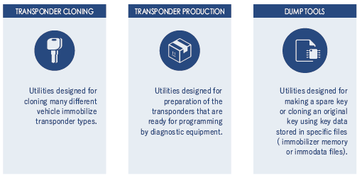 Geralmente chips especiais são usados para TRANSPONDER CLONING . A clonagem de transponder na maioria dos casos requer menos tempo e não requer o transponder de fábrica e equipamento adicional. Junto com isso, você também pode usar transponders especiais com quaisquer opções de software que exijam um transponder de fábrica, como TRANSPONDER PRODUCTION ou DUMP TOOL .