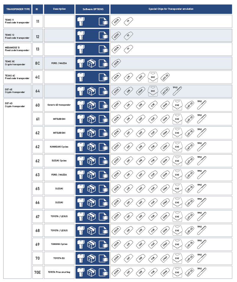 Para produzir uma cópia da chave, você deve usar um chip especial para emular o transponder da chave imobilizadora. O software Key Tool suporta uma ampla gama de chips especializados de pós-venda (transponders virtuais) que são adequados para emular vários tipos de transponders de chave de carro.