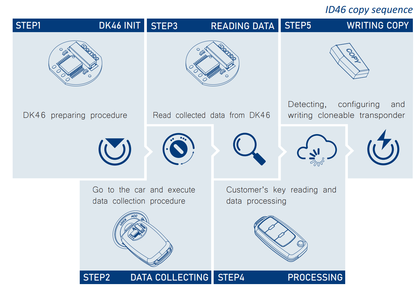 Para copiar o ID46 , é necessário realizar a coleta de dados da chave do veículo no momento em que a ignição é ligada. Para esta operação, você deve usar a chave original e um dispositivo especial - DK46
