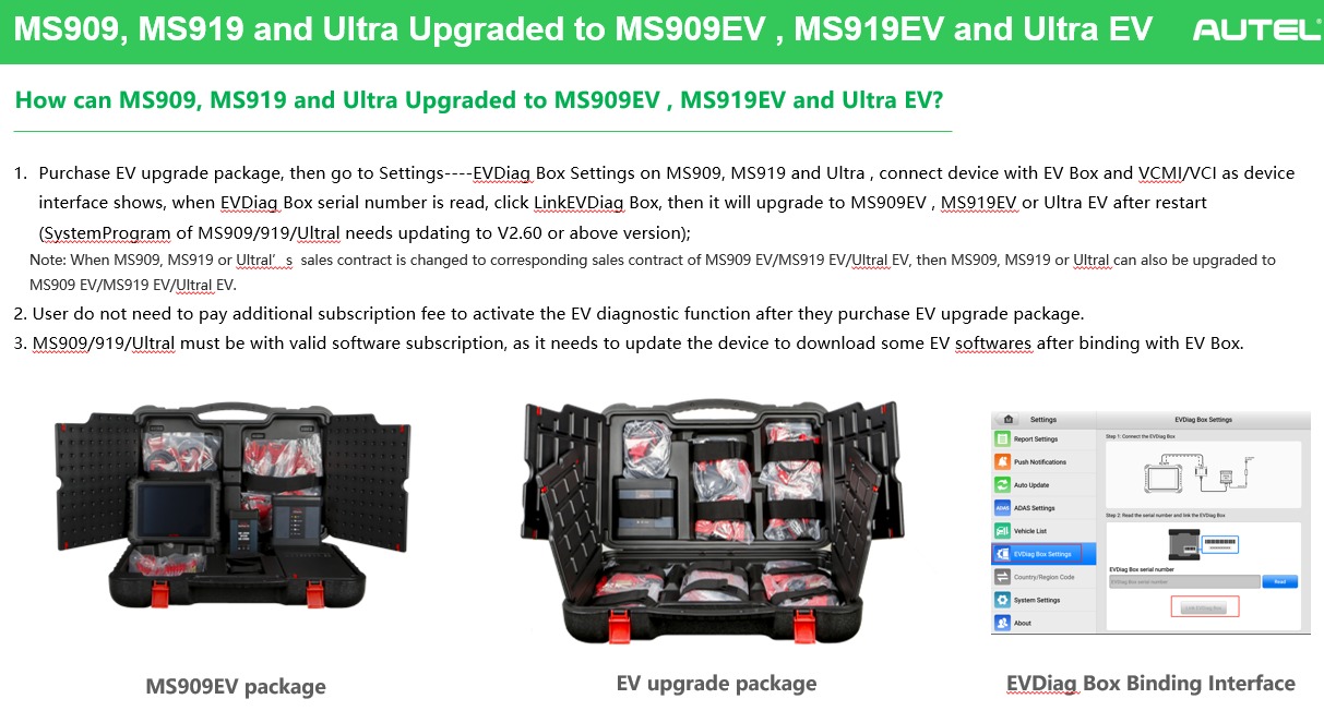 EV Tanılama Yükseltme Kiti, EVDiag Kutusu, test yazılımı ve elektrikli araç akü paketlerinin test edilmesini sağlayan özel araçlara yönelik adaptörler içerir. EVDiag Kutusu, MaxiSys Ultra, MaxiSys Ultra ADAS, MaxiSys MS919 ve MaxiSys MS909 ile uyumludur.